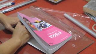 Langkah demi langkah penyampulan buku dengan bahan mika atau plastik transparan. Alat yang digunakan Cutter.